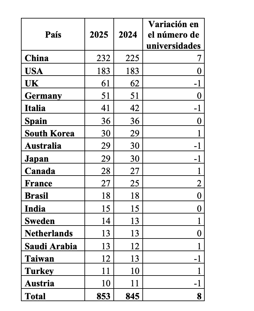 يحافظ النظام الجامعي الإسباني على عدد الجامعات في التصنيف (36)، على الرغم من أن التباين مقارنة بالعام السابق في كل من التقييم والمراكز يظهر رصيدًا صافيًا سلبيًا.