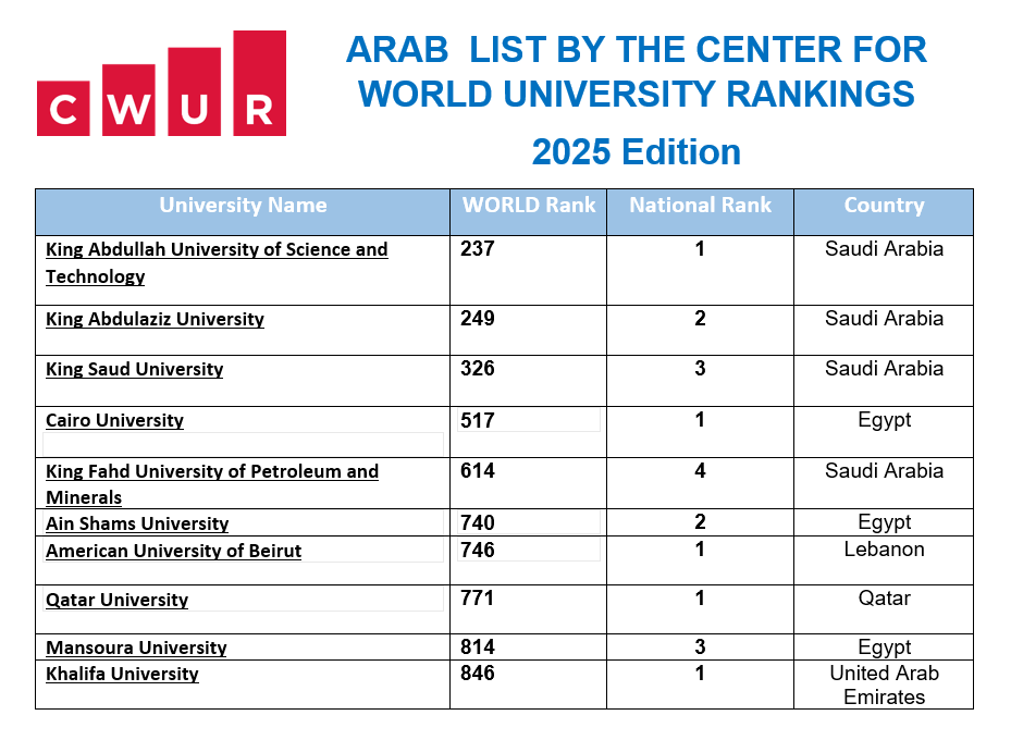 اول 10 جامعات عربية في تصنيف مركز تصنيفات الجامعات العالمية (CWUR) لعام 2025