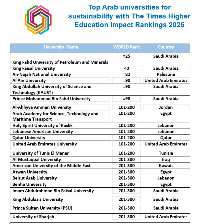 الجامعات العربية العشر الأولى في تصنيف التايمز للأثر لعام 2025